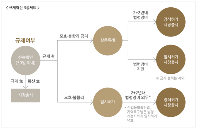 - 임시허가: 검증된 신제품・신서비스임에도 관련 규정이 모호하거나 불합리해 시장 출시가 어려울 경우, 일정 조건 내에서 임시 허가로 시장 출시를 허용하는 제도