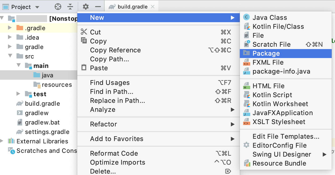 src/test/java/ 위치에 src/main/java/ 아래에 있는 것과 동일한 패키지를 생성합니다.
