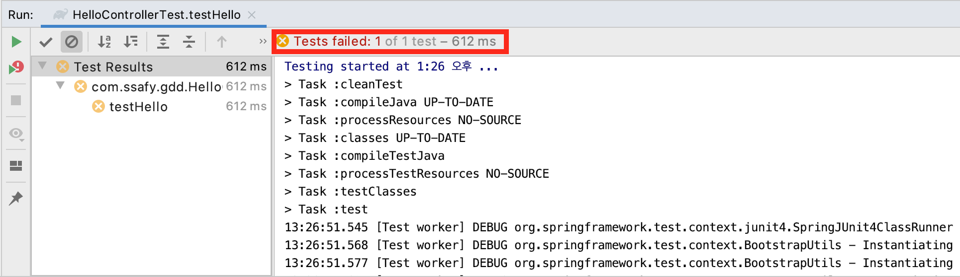 위와 같이 테스트에 실패한 것을 확인할 수 있습니다.
