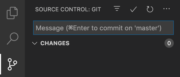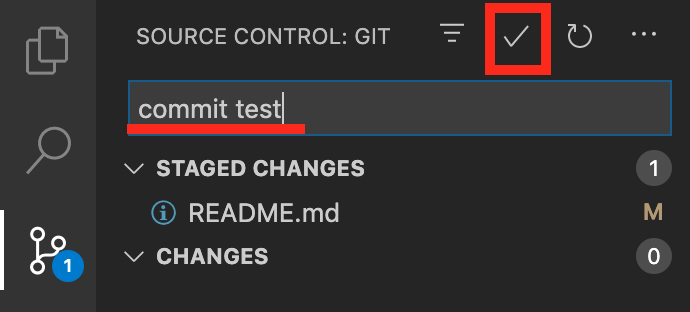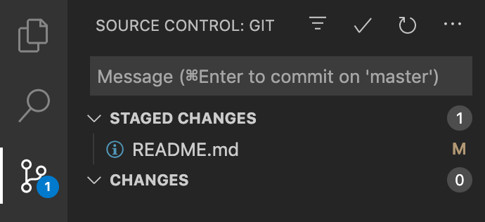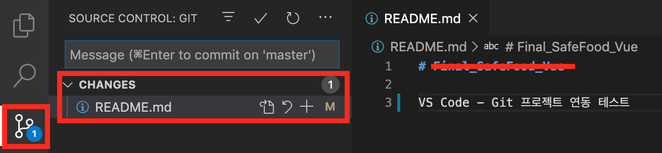 왼쪽 메뉴바의 3번째 아이콘에 1이라는 숫자가 표시되고, CHANGES에 README.md 파일이 표시됩니다.