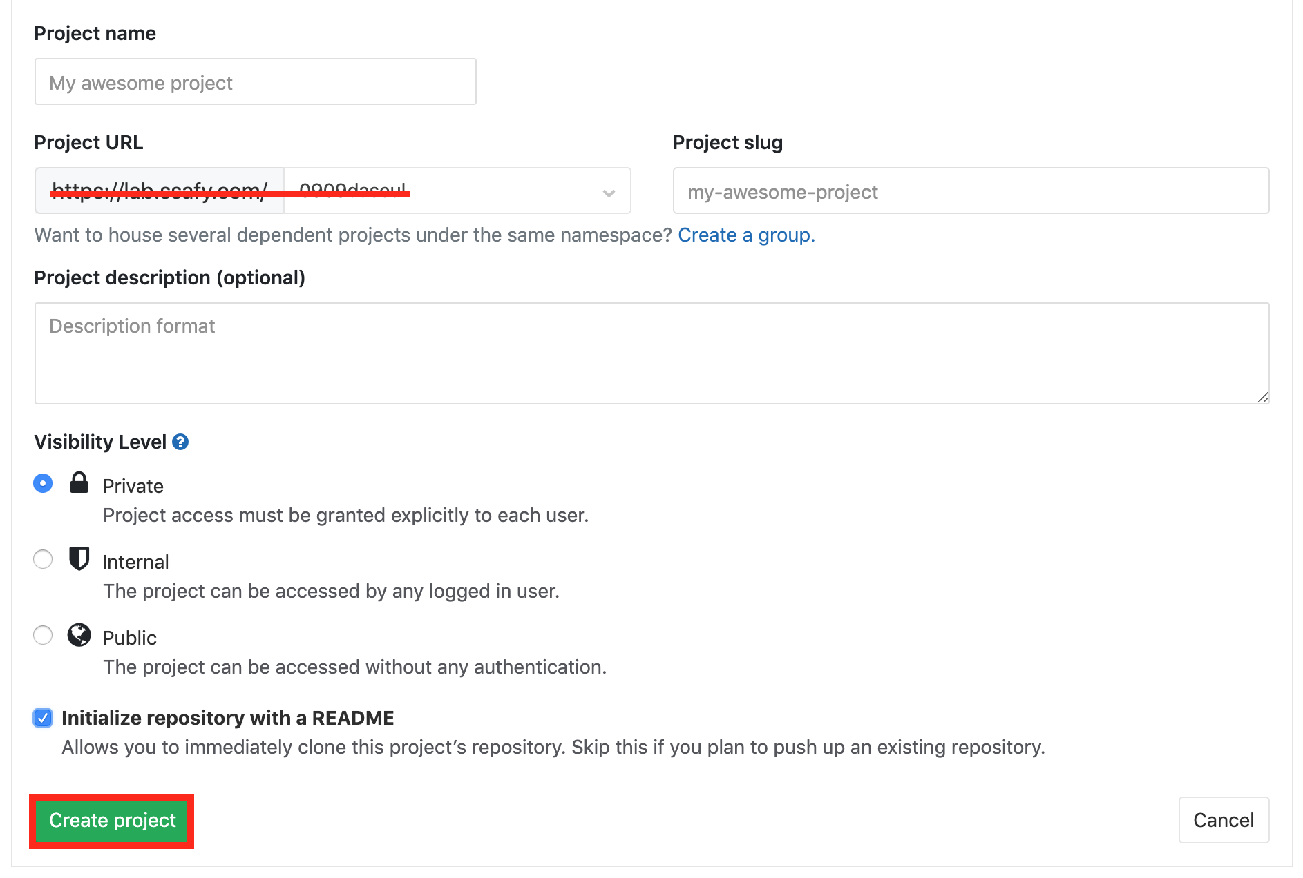 Project name, Visibility Level를 원하는 대로 설정한 다음,