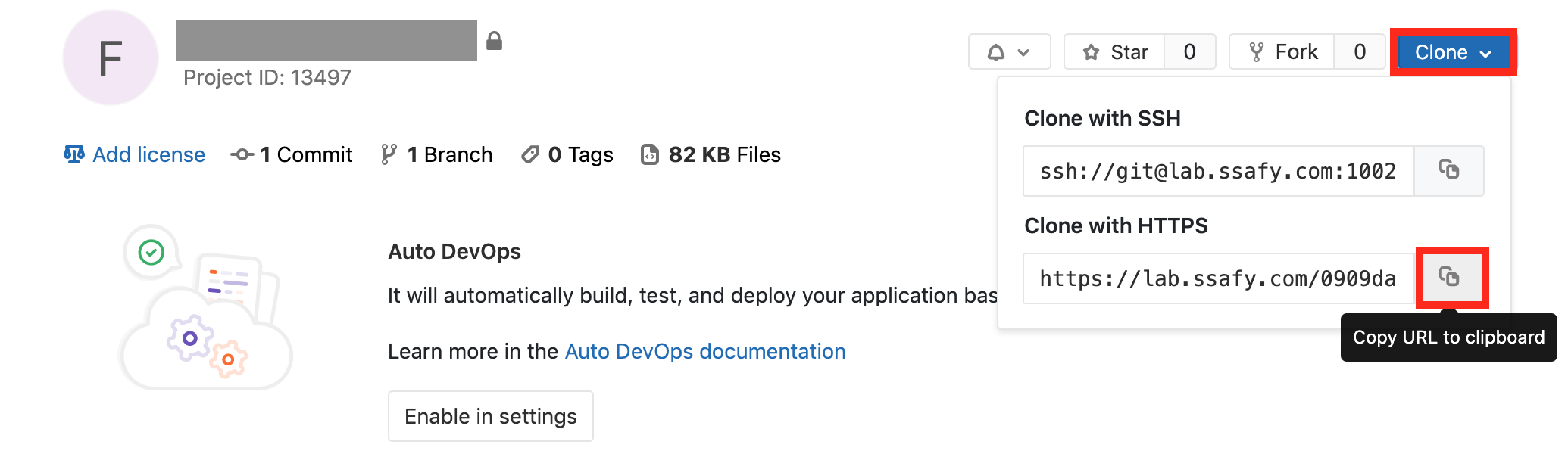 Git의 프로젝트 페이지에서 오른쪽 상단의 Clone 버튼을 누르고, Clone with HTTPS를 눌러 Git 프로젝트 url을 복사합니다.