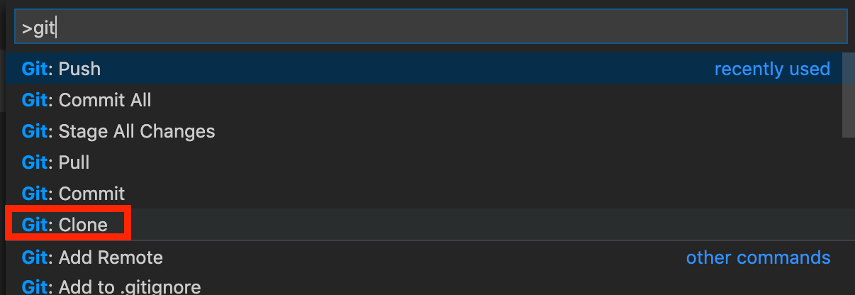VS Code에서 F1을 누른 후, git을 검색해 Git: Clone을 선택합니다. 그다음 뜨는 창에 조금 전에 복사한 url을 붙여 넣어줍니다.